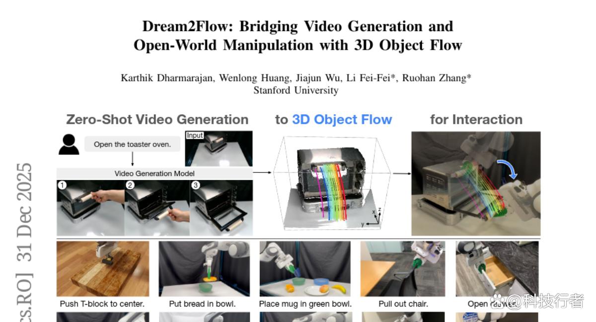 当我们人类想学一项新技能时,最常见的方法就是看别人怎么做——看视频教程、观察师傅操作,然后模仿着练习。斯坦福大学的研究团队在2024年12月发表的一项研究中,成功地让机器人也掌握了这种"看视频学本领"的能力。这项名为"Dream2Flow"的研究由斯坦福大学的Karthik Dharmarajan、Wenlong Huang、Jiajun Wu、Li Fei-Fei和Ruohan Zhang等学者联合完成,论文编号为arXiv:2512.24766v1。