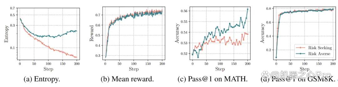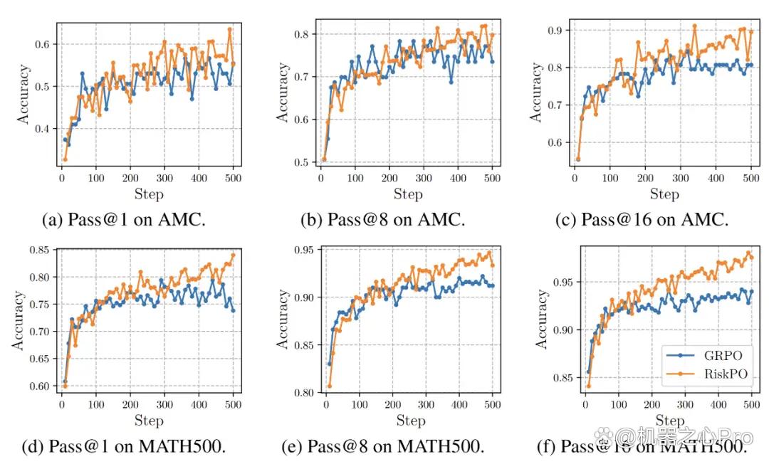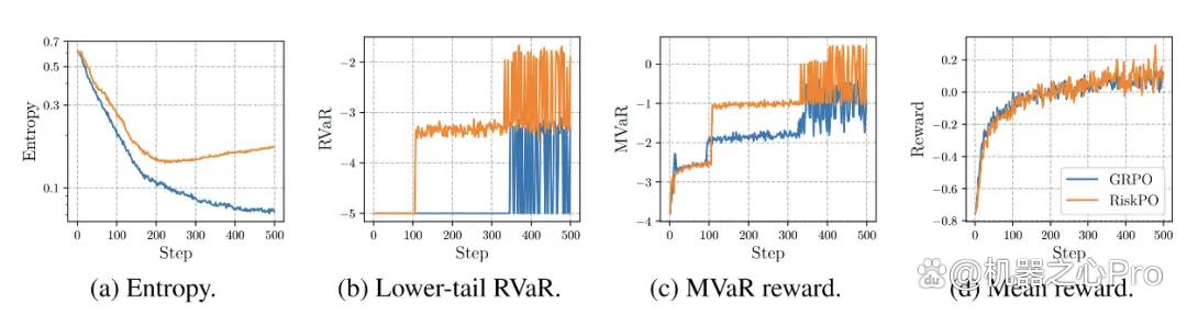 实验中也能清晰看到:训练 500 步后,GRPO 的熵值已趋近于 0,而 RiskPO 仍能维持 0.2 以上的熵水平,确保对难任务的持续探索。