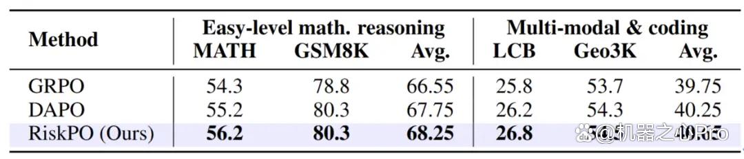 好的技术方案,终要靠硬指标说话。北大团队在数学推理、代码生成、多模态推理三大领域的 10 余个数据集上,用数据证明了 RiskPO 的突破性 —— 尤其在最能体现推理能力的「硬任务」上,优势远超 GRPO 及其变体。