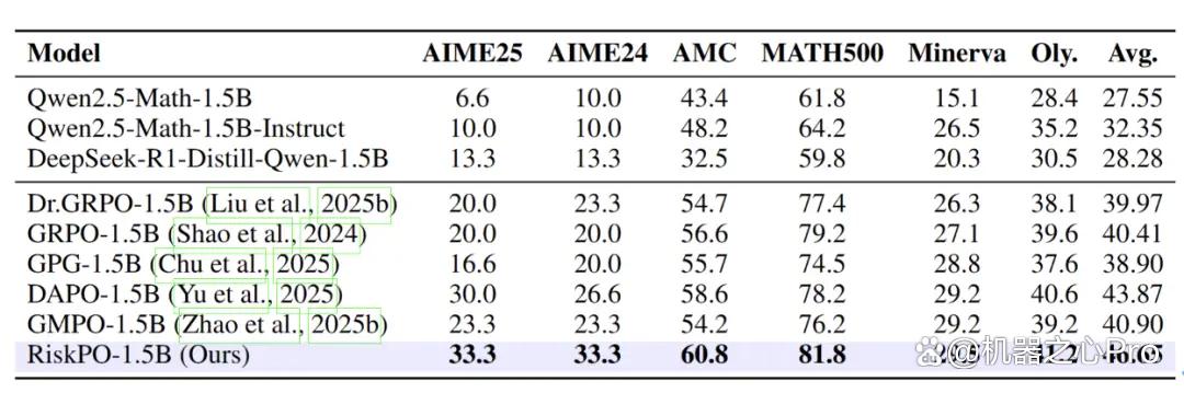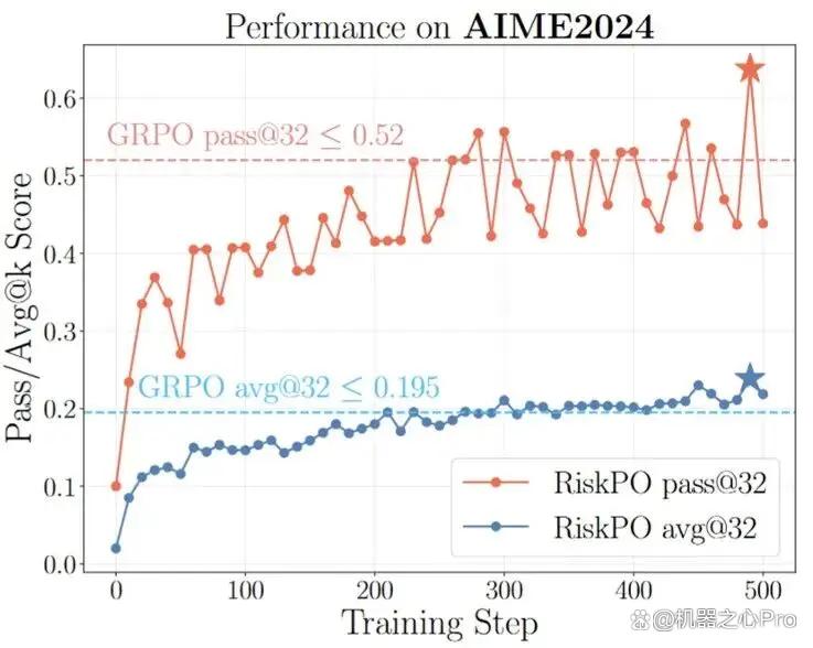 在数学推理领域,RiskPO 在 AIME24(美国数学邀请赛)任务上表现惊艳:Pass@32 得分比 GRPO 高出近 7 个百分点,比最强基线 DAPO 提升 6.7 个百分点;即便是相对简单的 MATH500 数据集,其 Pass@1 也达到 81.8%,超出 GRPO 2.6 个百分点。