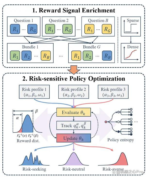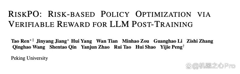 为解决传统均值优化的缺陷,北大团队提出 RiskPO,核心突破在于将风险规避(risk-averse)理念融入优化目标,用「关注奖励分布左尾(难任务)」替代「追求整体均值」,从根本上引导模型突破推理短板。