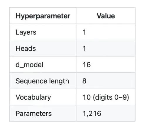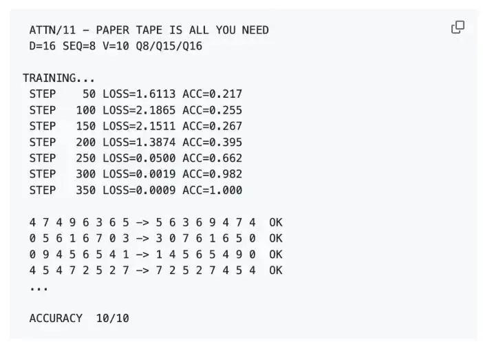 项目结果显示,在一台 1970 年代的计算机上,一个仅有 1216 个参数、单层单头的 Transformer,在约 350 步训练后就实现了 100% 的准确率,而训练时间只有 5 分钟左右。