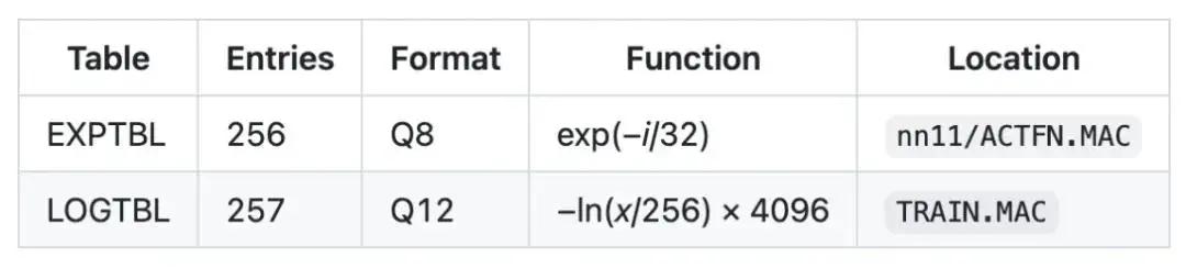 ATTN/11 使用两个查找表。第一个将每个索引映射为 Q8 表示的 exp (−i/32),在 softmax 中用一条「MOV」指令替代指数计算。另一个表主要用于便利计算,将每个值映射为 Q12 表示的 −ln (x/256),每 50 步用于计算交叉熵损失,以监控模型收敛情况。