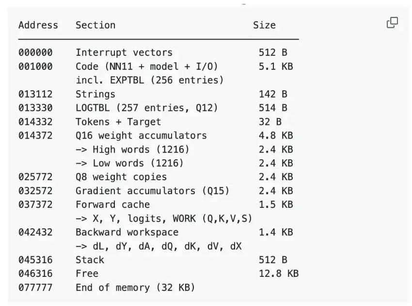 这 1216 个参数由于计算需要被复制了三份:Q16 累加器(4.8 KB)、用于前向计算的 Q8(2.4 KB),以及用于梯度的 Q15(2.4 KB)。仅模型本身就占用了 9.6 KB,是整体内存使用中占比最大的部分。