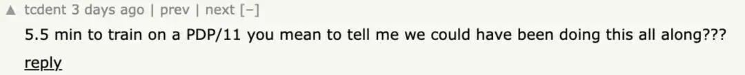 一位网友该项目「在 PDP-11 上训练只要 5 分钟」表示惊讶,而更让他震惊的是,这似乎说明「我们其实一直都可以做到这些???」