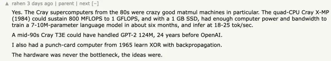另一位网友则认为,不必惊讶,是的,我们一直可以做到这些。因为,「1980 年代的 Cray 超级计算机非常厉害,尤其在矩阵乘法方面性能极其强大。