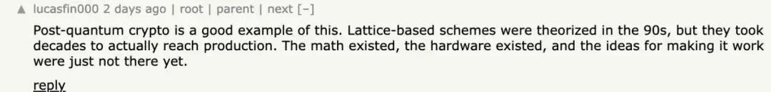 另一位网友也现身说法,他举了后量子密码学的例子。他表示,基于格(lattice)的加密方案早在 1990 年代就已被提出,但真正走向产业落地,却花了整整几十年,而问题的关键不在于数学不成熟,也不在于硬件不足,而是让这些理论真正「跑起来」的关键思路,当时还没有出现。