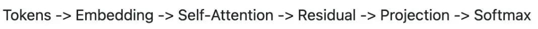 数据路径很直接,token 被嵌入,通过带有残差连接的自注意力层,然后映射回词表并通过 softmax 得到预测: