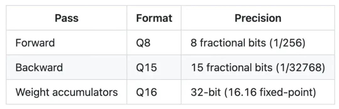 从而在训练过程中完全避免了对数运算的开销。该结果最初以 Q8 表示,随后左移 7 位转换为 Q15,这是整个反向传播过程中使用的数值格式。同一个 SFTMX 例程同时用于前向与反向计算,无需单独实现反向传播版本。