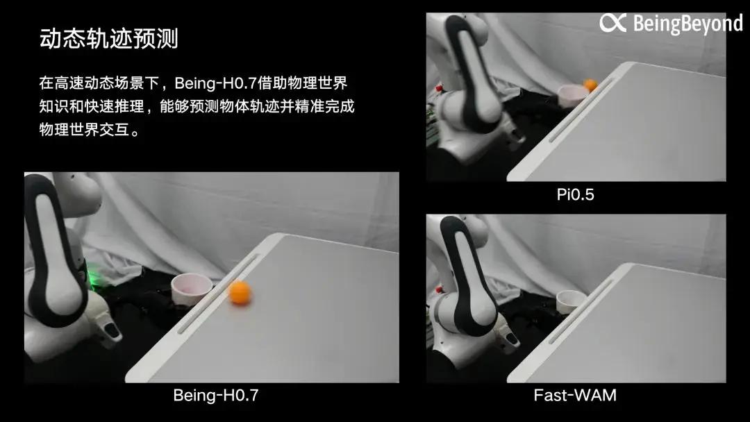 动态轨迹预测:在高速动态场景下,Being-H0.7 借助物理世界知识和快速推理,能够预测物体轨迹并精准完成物理世界交互;