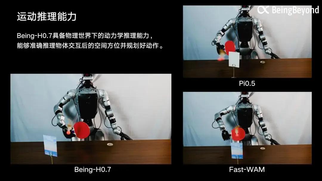 运动推理能力:Being-H0.7 具备物理世界下的动力学推理能力,能够准确推理物体交互后的空间方位并规划好动作。