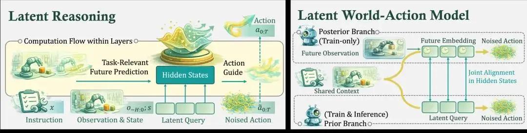 不同于 VLA 从当前观察直接映射到动作,或视频生成式世界模型引入庞大的预测模块,Being-H0.7 在模型内部引入了一组可学习的中间变量(latent queries),作为一块预留的「思考空间」(latent reasoning)。在前向的过程中,模型将当前观测、任务目标以及对未来可能演化的判断压缩至这一空间,并由其统一指导最终的动作生成。
