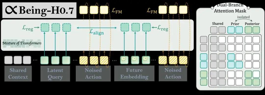 但这一「思考空间」本身并不天然具备对未来的建模能力。为此,Being-H0.7 采用了双分支设计:一条路径在「未来可见」的条件下(后验视角,posterior branch),引导模型学习哪些中间判断真正有助于动作决策;另一条路径在「不可见未来」的真实部署条件下(先验视角,prior branch),约束模型仅基于当前观测形成尽可能一致的判断。