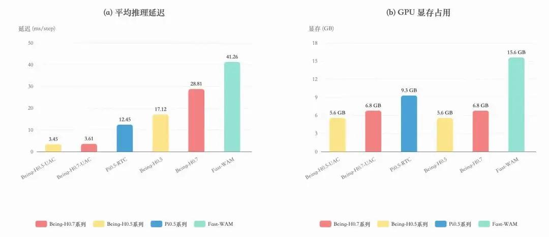 在实现上,H0.7 的结构反而相对简洁:两路视角通过注意力掩码(attention mask)共享主干上下文,只在 latent queries 处进行对齐,并共同接受动作监督。未来信息无需解码为未来图像,而以紧凑表征参与训练。相比 Cosmos Policy 这类视频生成式世界模型,H0.7 的训练成本不到其 1%。