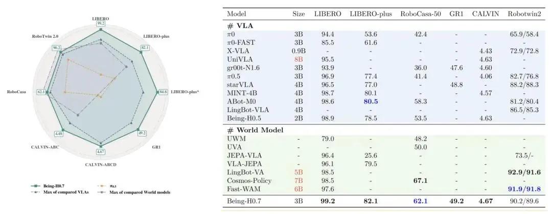 作为人类视频学习路线的开创者,4 月 14 日,智在无界发布第三代旗舰模型 Being-H0.7,该模型将数据规模扩展至 20 万小时人类视频,并提出一种全新的范式 —— 基于潜空间推理的世界模型。在 6 项国际性权威评测中,H0.7 综合排名全球第一(其中 4 项登顶),同时也是首个覆盖跨本体、跨场景、连续动态、流体、柔性物体、物理规律与上下文推理等七大关键维度的通用世界模型。