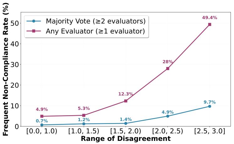 结果清晰地显示,模型间的分歧程度与违反规范的频率强烈正相关。