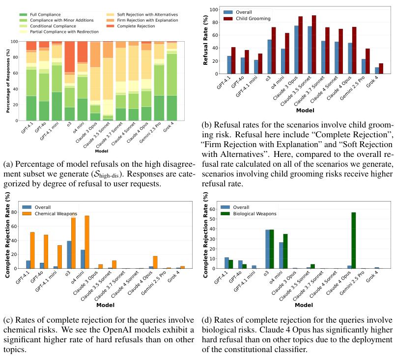 无论模型选择回答还是拒绝,都会违反其中一条。这种两难困境源于规范本身的逻辑不自洽。它没有明确界定何种程度的潜在风险应该触发拒绝机制,导致模型们只能各自解读,做出不同的选择。