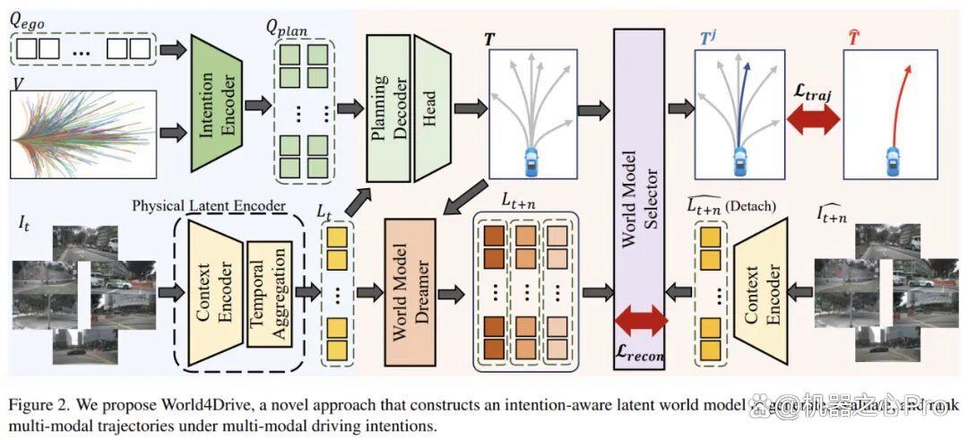 图片World4Drive 首先提取场景特征,随后基于当前场景特征和驾驶意图生成多模态规划轨迹,并在预测多个未来状态,它还引入世界模型选择器模块来评估和选择最佳轨迹,可以实现无需感知标注的端到端规划。