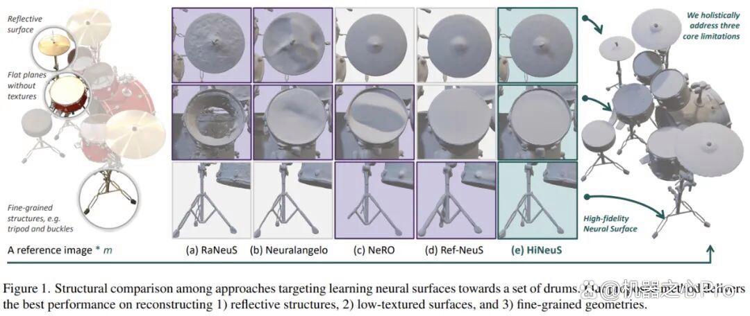 论文《HiNeuS: High-fidelity Neural Surface Mitigating Low-texture and Reflective Ambiguity》中,作者提出统一框架 HiNeuS,解决了复杂场景下神经表面重建的多个持续挑战:既可以透过连续遮挡建模后面的形状,也能把规则形状正确对齐好,还能在不牺牲全局内容的情况下保持细节。