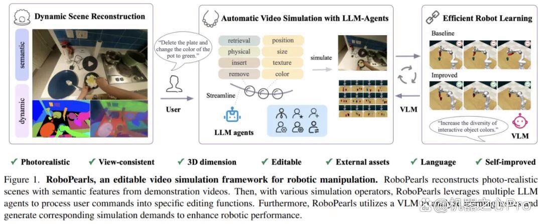 图片论文《RoboPearls: Editable Video Simulation for Robot Manipulation》中,作者提出了用于机器人操作的可编辑视频模拟框架 RoboPearls,它基于 3DGS 构建,能够从演示视频构建照片般逼真、视图一致的模拟,并支持各种模拟算子,包括各种对象操作。