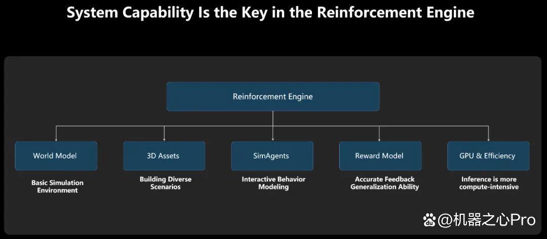 现有的仿真场景对泛化性要求不高,合成数据可以不要求实时性,可以通过更大规模的模型和 pipeline 来优化。但是,强化学习既要求泛化性也要求时效性,还要求大规模的并发。因此理想认为,强化学习引擎最关键的五个因素在于:世界模型、3D 资产、仿真智能体、奖励模型和性能优化。