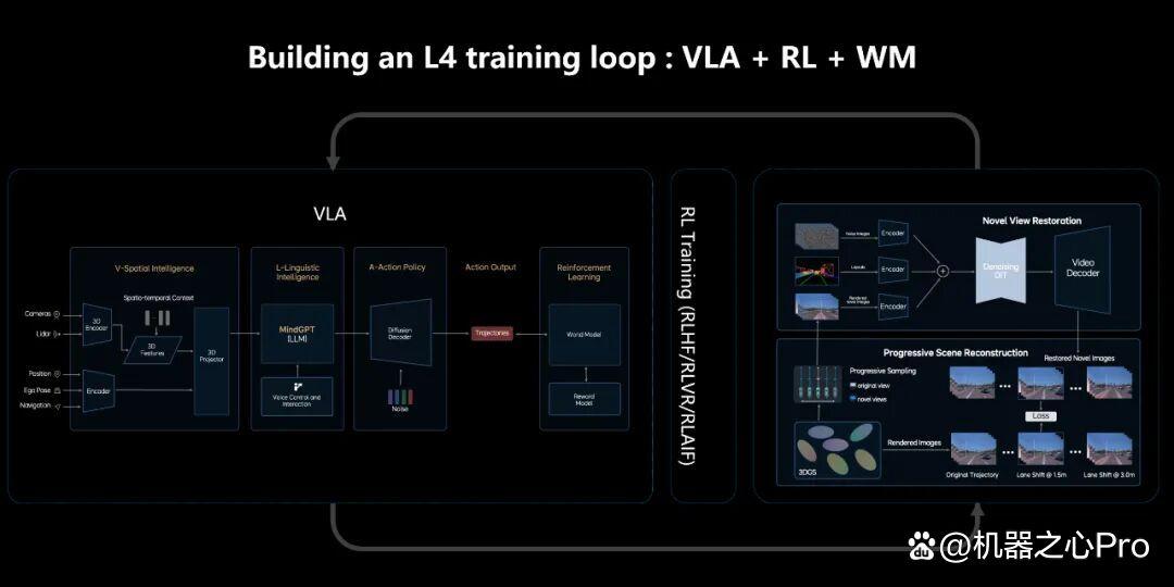 图片具体而言,理想希望构建一套具备先验知识和驾驶能力的 VLA 车端模型,并构建云端世界模型的训练环境为其进行训练。训练环境中既包含采集到的真实世界数据,也包含合成数据,又包含可以跟随模型一起探索的数据。然后,通过强化学习的体系,包括 RLHF/RLVR/RLAIF 等范式,可以不断训练模型,最终实现迭代训练的目标。