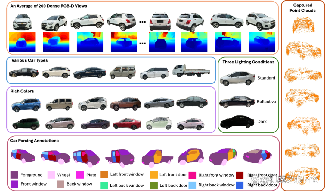 在论文《3DRealCar: An In-the-wild RGB-D Car Dataset with 360-degree Views》中,研究人员提出了业界首个大规模 3D 真实汽车数据集 3DRealCar。它通过对 2500 辆汽车,三种不同光照条件下的精细 3D 扫描,获得了贴近真实世界水平的汽车图像和点云,可帮助人们实现高保真的 3D 重建。