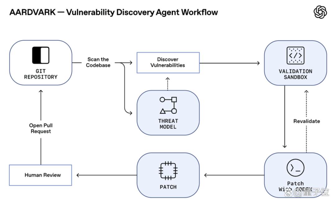 具体来说,它的工作流程从Git仓库出发,依次经历:威胁建模→漏洞发现→沙盒验证→Codex 修复→人工复审→ 提交Pull Request。