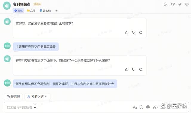 最直接的是对话方式,就像日常用的ChatBot那样,用户需要向智能体介绍专利应用领域,然后它会问用户专利带来的好处。