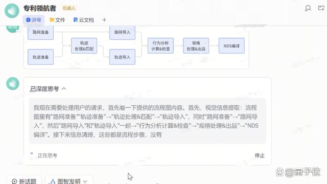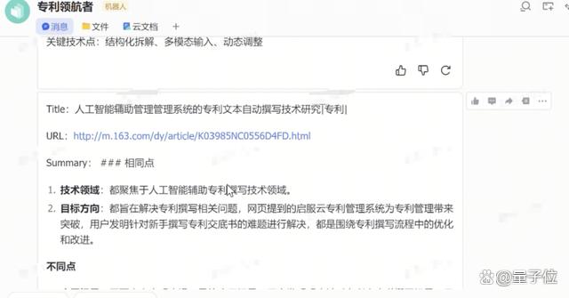 在用户回答完毕后,智能体会开始思考,给用户提供专利撰写的初步想法,接着会搜索网上已有材料,与用户当前的专利想法对比异同,提炼出新专利的新颖点,并以关键词的形式展示。