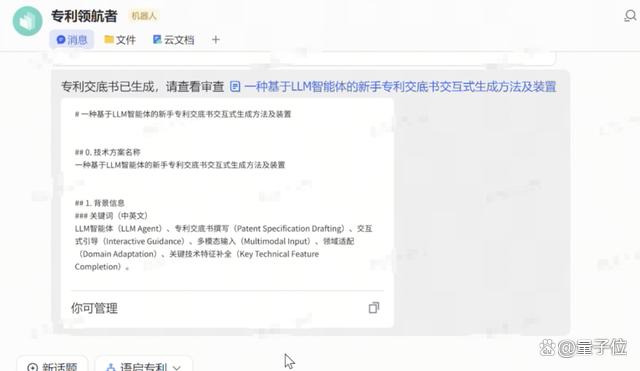 接着,用户再输入初步想法与专利关键点,智能体判断条件齐全后会输出一份专利交底书的初稿,并直接转成飞书文档,方便后续协作。
