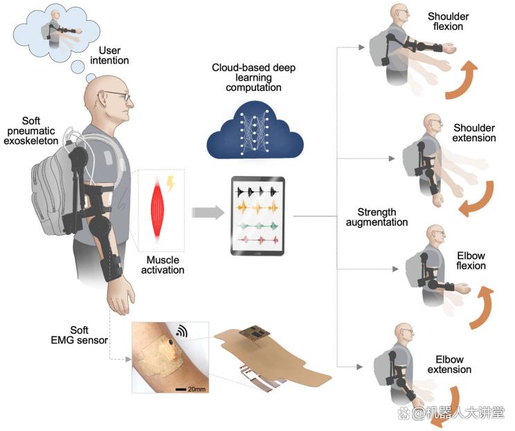 怎么做到的?研究人员给外骨骼装上了柔性生物电子传感器,专门捕捉你的肌肉信号。再配合云端深度学习算法,实时分析你想干啥。