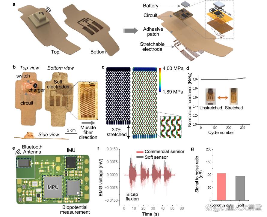 首先是传感器的突破。研究团队开发了一种超薄柔性EMG(肌电图)传感器,可以像创可贴一样贴在皮肤上。这种传感器采用了蛇形金纳米膜电极设计,即使在30%的拉伸应变下,经过300次循环测试后电阻变化依然微乎其微。