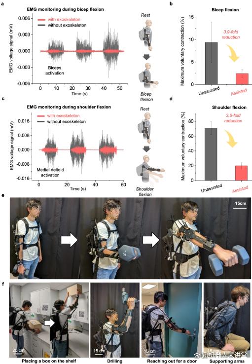 图片即使在负重情况下,外骨骼依然表现出色。当测试者手持6.8公斤(15磅)哑铃时,外骨骼能够将肘关节屈曲时的肌肉活动降低1.4倍,肩关节屈曲时降低1.6倍。